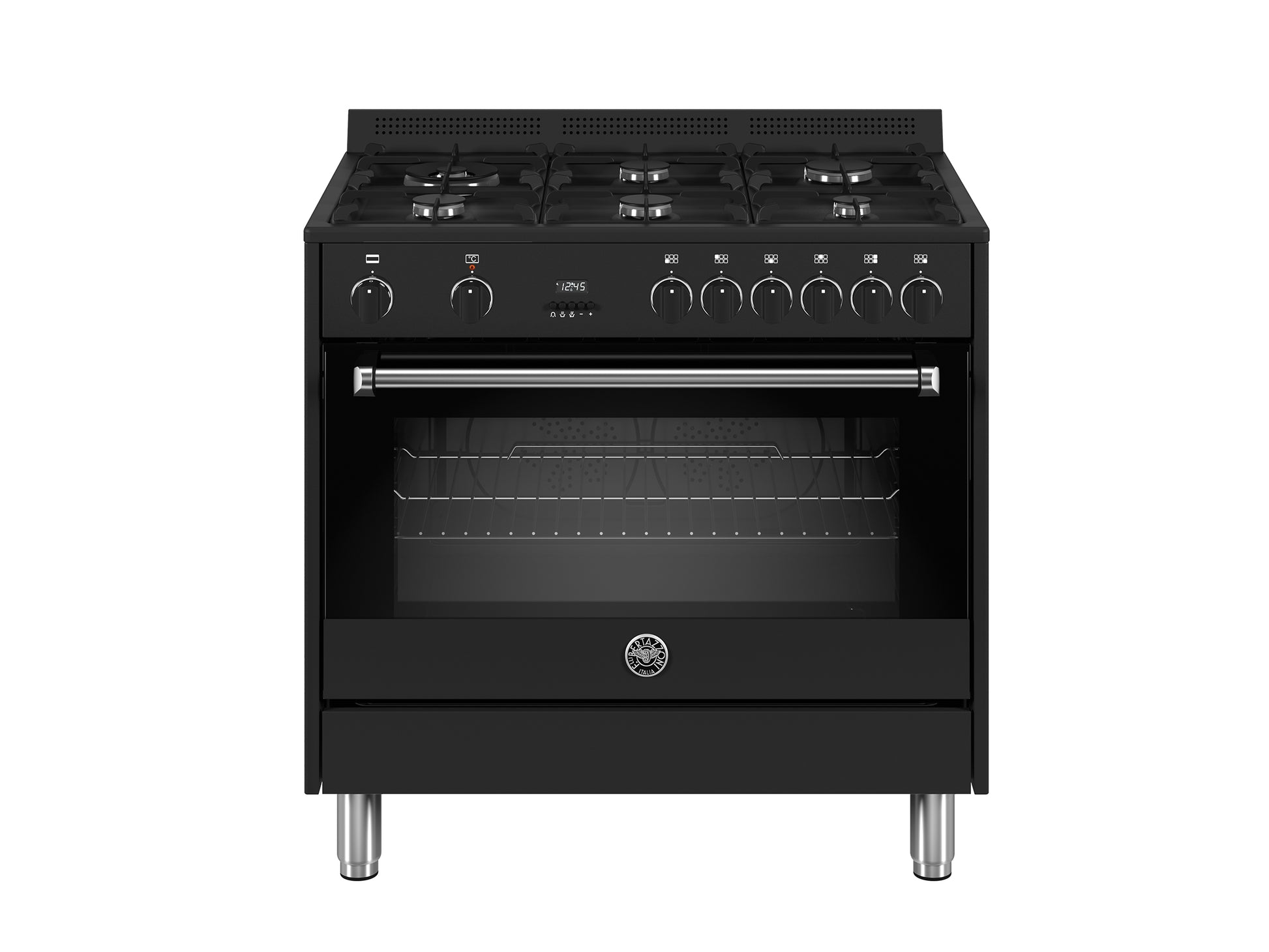 Dit fornuis met enkele oven heeft een volledig zwarte vangschaal uit één stuk met 6 branders met een enorm kookoppervlak omdat de branders ver uit elkaar staan. De elektrische oven is multifunctioneel en heeft 11 verschillende functies. De oven heeft een elektronische touch-control programmaklok. De ovendeur bestaat uit drielaags glas met een brede, uitneembare glasplaat.